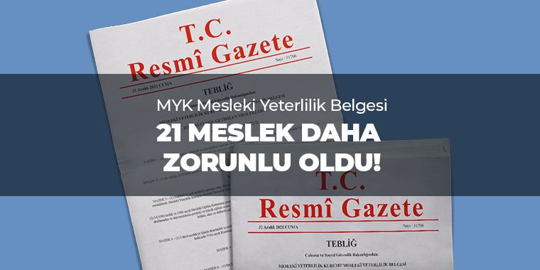 DetailsMYK Mesleki Yeterlilik Belgesi 21 Meslek Daha Zorunlu Oldu! MYK Mesleki Yeterlilik Belgesi Zorunluluğuna 21 Meslek Daha İlave Edildi. Mesleki Yeterlilik Kurumu Mesleki Yeterlilik Belgesi Zorunluluğu Getirilen Mesleklere İlişkin Tebliğ 31 Aralık 2021 tarihli ve 31706 sayılı Resmî Gazete’de yayımlanarak yürürlüğe girmiştir. Söz konusu tebliğ ile MYK Mesleki Yeterlilik Belgesi zorunluluğu getirilen meslek sayısı 183’den…